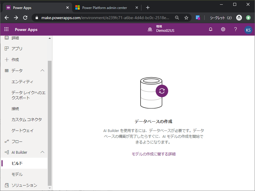 Power Apps に戻り、先ほど作成した環境になっていることを確認したうえで、サイドメニューからAI Bilderを展開して「ビルド」をクリック。CDSのデータベースが必要とのことなので、データベースを新規作成します。