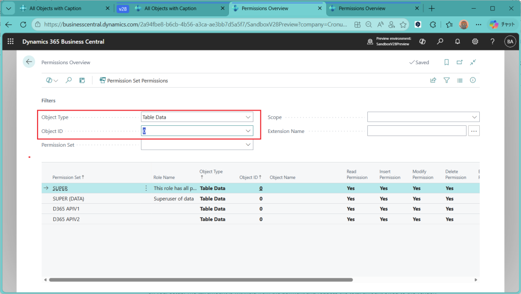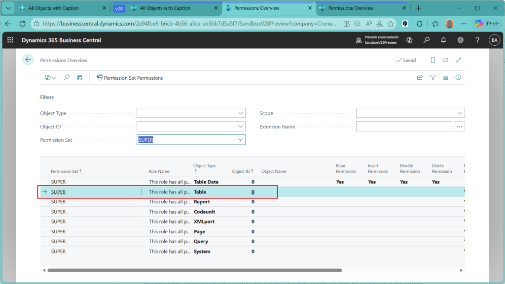 これは権限セットではオブジェクト番号”0”がワイルドカードとして機能する仕様だからです。Superではすべてのオブジェクトでオブジェクト番号を”0”で定義しています。この辺を加味しないとこの権限概要ページを使った権限調査に抜け漏れが出ます。