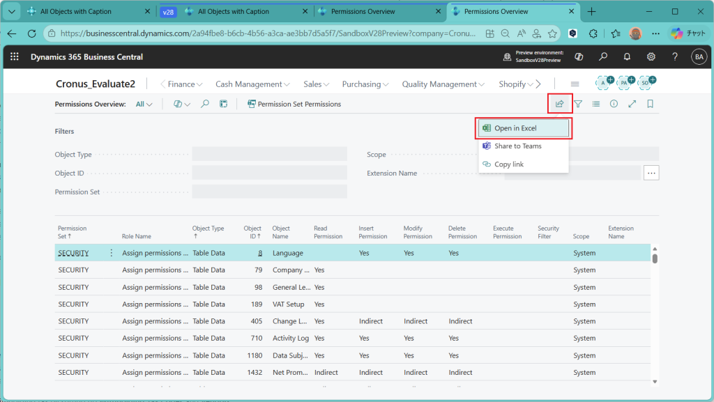 また別の角度から。権限概要ページにOpen in Excelボタンがあるので押してみます。