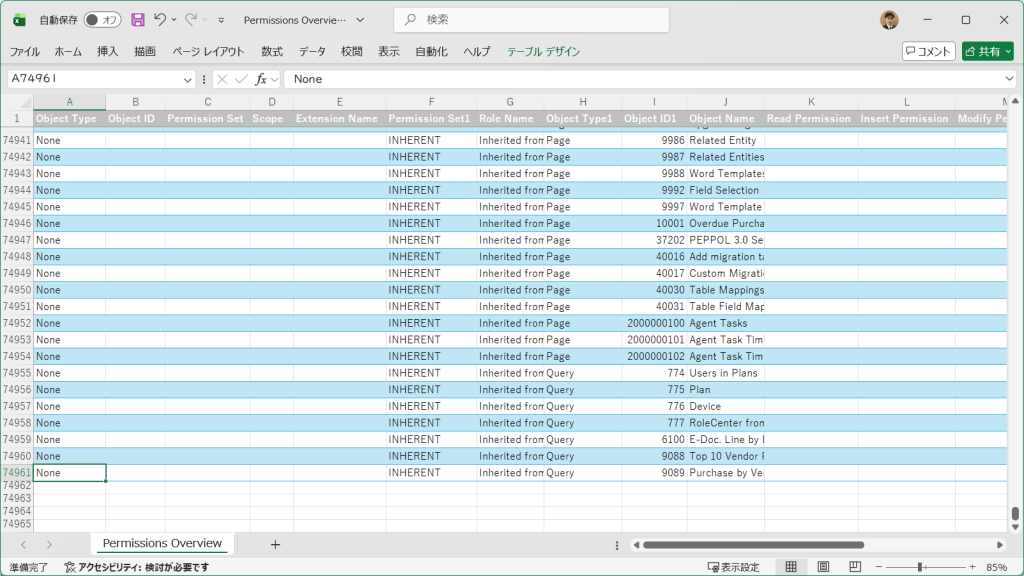 1分くらい待たされるのですが、このような画面が開きます。(権限セットの設定量によって待ち時間は変わります。)ヘッダー部分には各種の抽出条件欄があり、明細部分には権限セット”Security”の権限設定内容が表示されています。