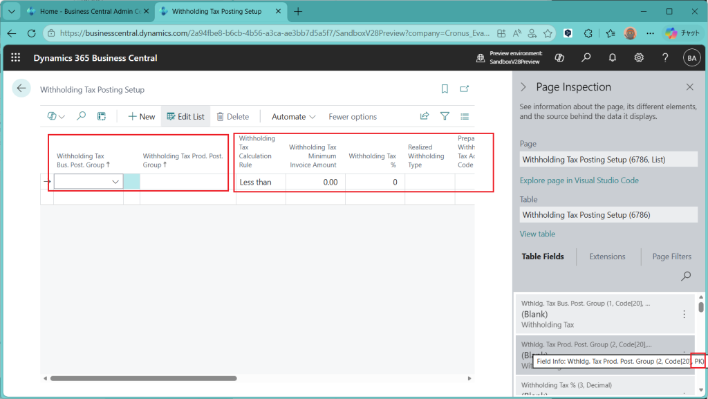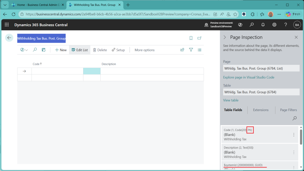 まずはWithholding Tax Bus. Post. Groupから。CodeとDescription(説明テキスト)の2項目のみで、Codeがキーになっていることがわかります。ページ検査機能で見る限り、隠れている項目もなく(3項目目にSystemidが来ていて、これは隠されてて良い)、シンプルな構造だとわかります。