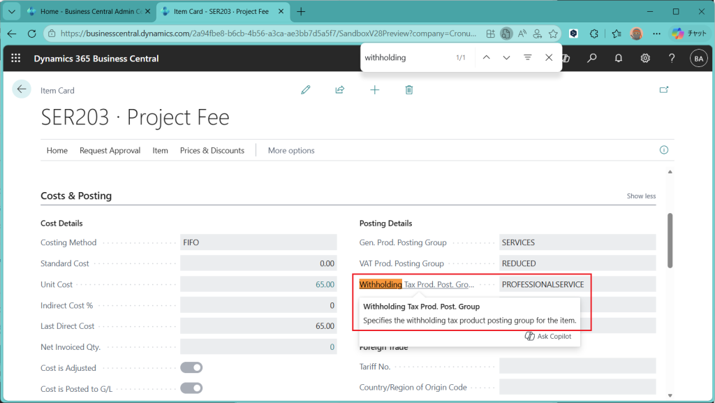 次に品目です。Cronusで一番近そうな品目としてここでは”SER203 Project Fee”を使います。Withholding Tax 系の項目は”Withholding Tax Prod. Post. Group”のみです。