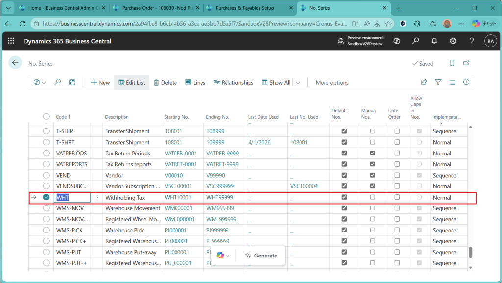 Purchase & Payable SetupにWithholding Tax用の付番体系を設定します。(ここもLearnに”準備事項”として書いておいてほしいところ)