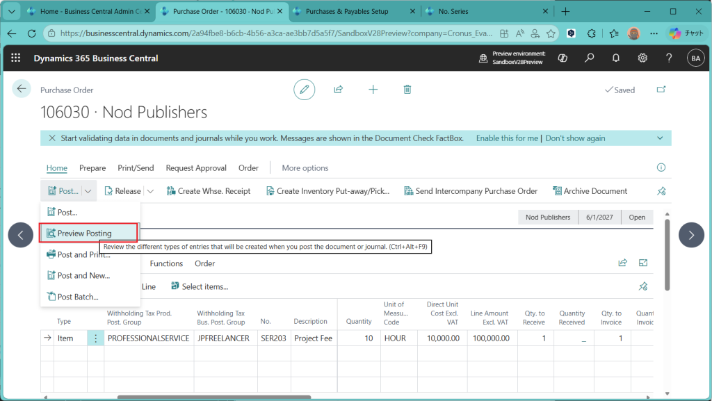 とりあえず、フリーランスのIT技術者にプロフェッショナルサービスを外注できるように1行目を設定しました。日本だと100万円以下は税率10.21%なんだそうです。100万円超えた時には別の税率が適用されますが、今回の新機能で受け止められるのかは次回以降に。(下限金額とシーケンス項目があるので、できそうなきはしています。)
