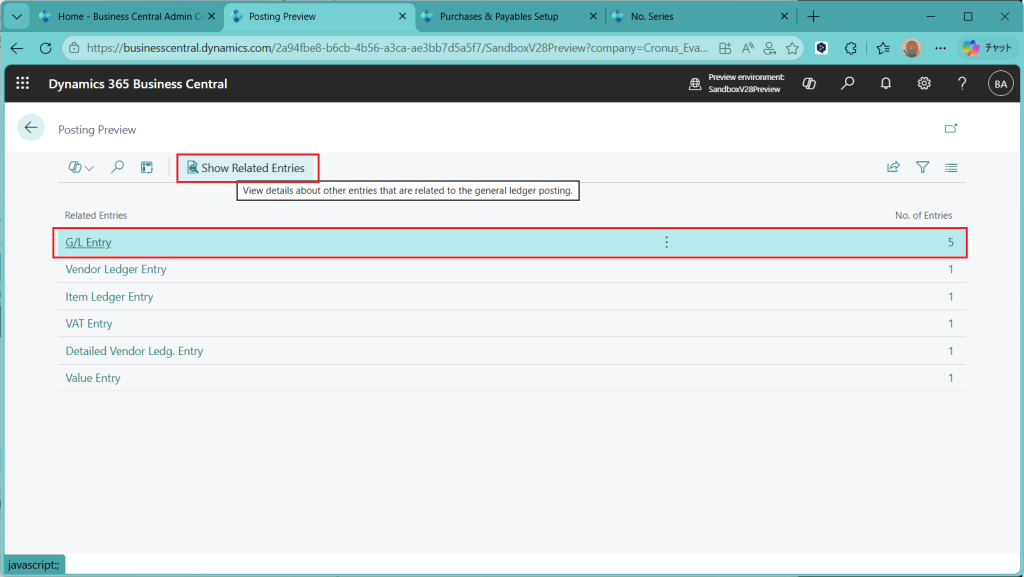 まずは General Ledger Setup から。メニュー検索で”General Ledger Setup”を検索して画面を開きます。
