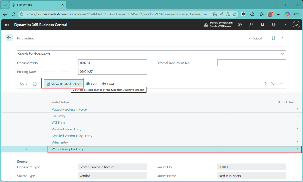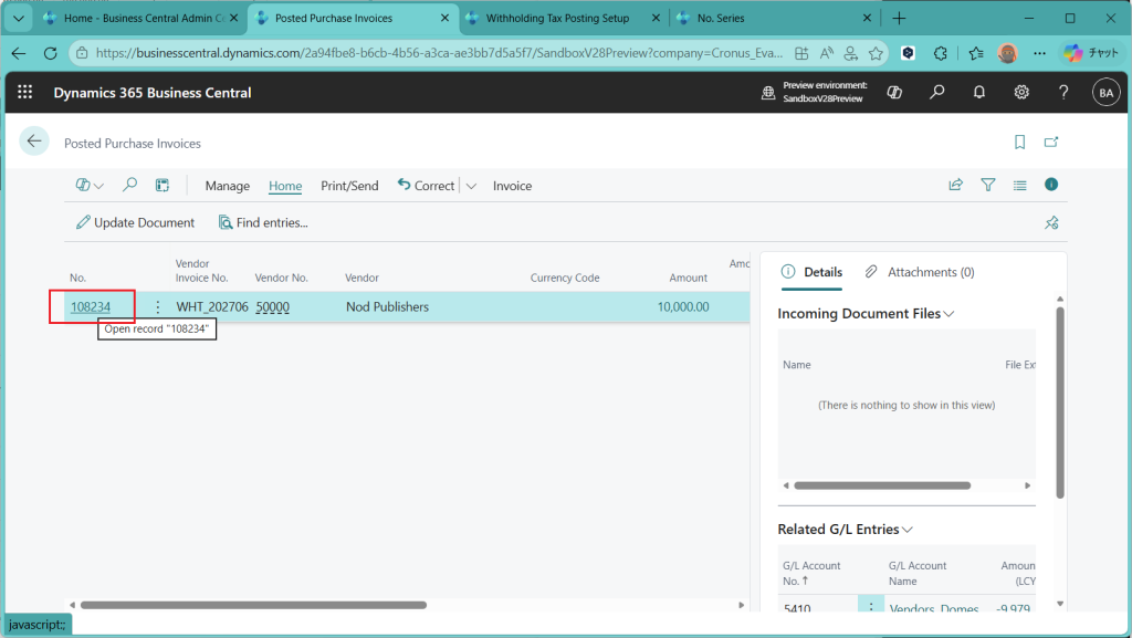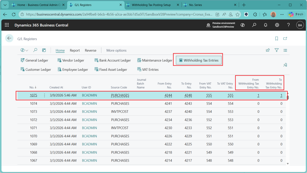 Withholding Taxの元帳明細はG/L Registerからも見れます。というか、G/L Register の画面が拡張されていました。VATと同じようにFrom-Toの番号が記録されていますし、紐づく補助元帳明細を照会することもできます。