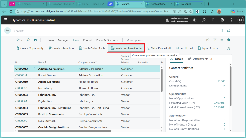 V28の画面に戻ります。既存の連絡先から購買見積を作ってもよいのですが、公式文書にはこの機能の利用価値として以下のように書いてあります。