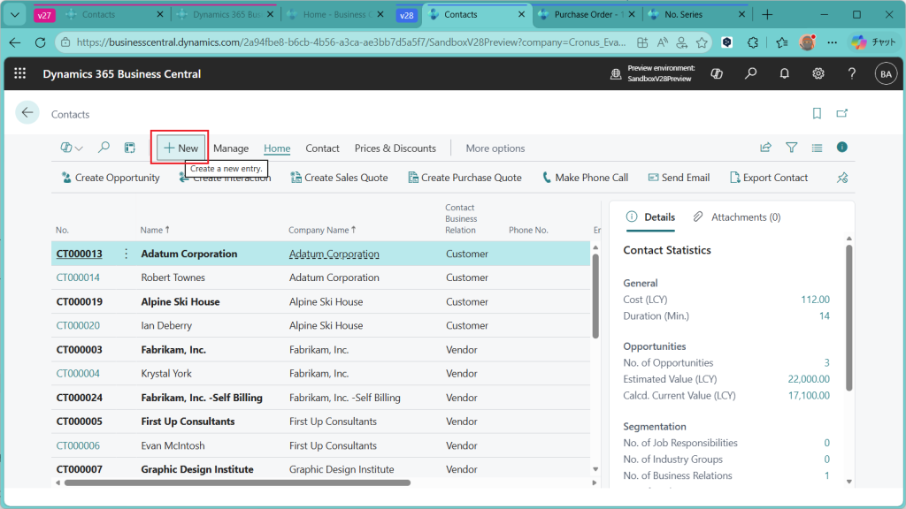 仕入先に紐づいていない連絡先は残念ながらCronusに存在しないので、新規で作成することにします。”+New”ボタンをクリック。