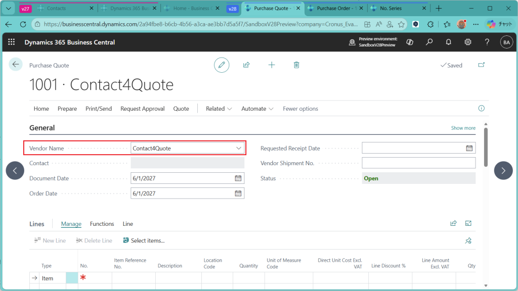 なので若干推測交じりにはなりますが、業務を想定しながら伝票入力を進めていきます。まずは仕入れ先に見積を依頼する品目を入力します。品目を入力すると”Direct Unit Cost Excl. VAT”が設定されます。これは税抜き単価のことで、品目マスタで持っている数値が自動で提案されます。あとで更新しますが、この時点ではそのままにしておきます。(目安となる金額として品目マスタの金額をそのまま保持する。)