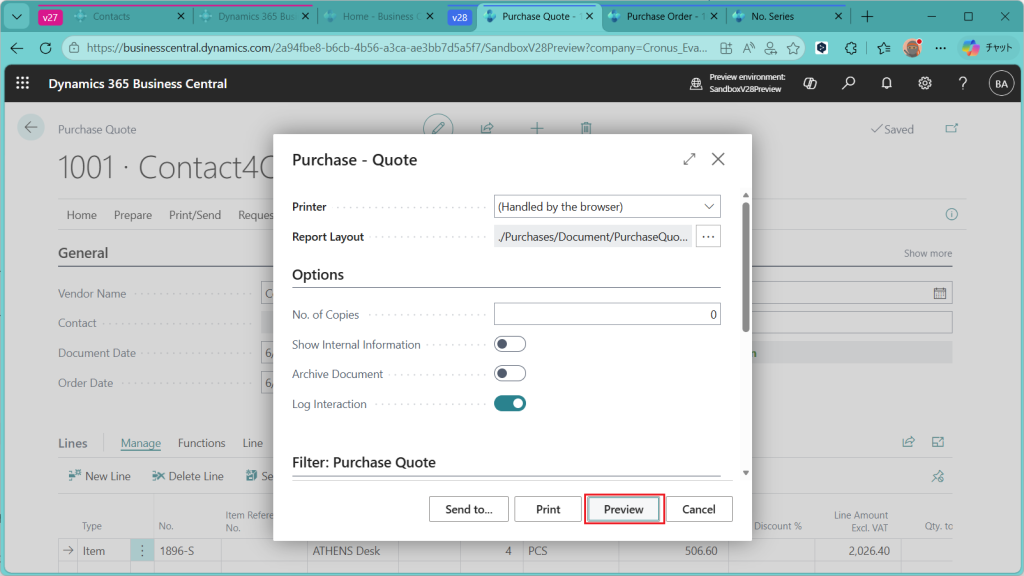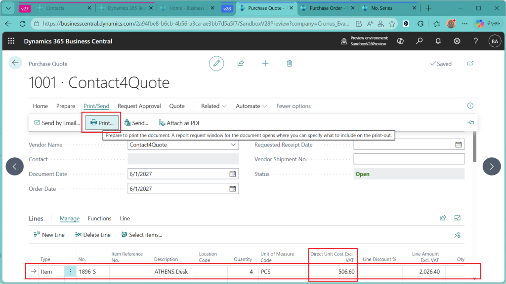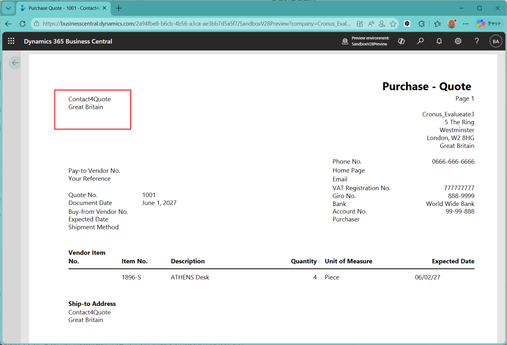 ”Purcase Quote”という帳票が出力プレビューされます。左上に取引先が来ており、明細行には品目と数量があるものの金額情報は乗っていないので、”見積依頼書”という位置づけになるかと思います。こちらを取引先に送って見積を依頼する、という業務の流れでしょう。(ただし見積依頼書をBCから出す会社がどれだけあるの?って話はあります。)