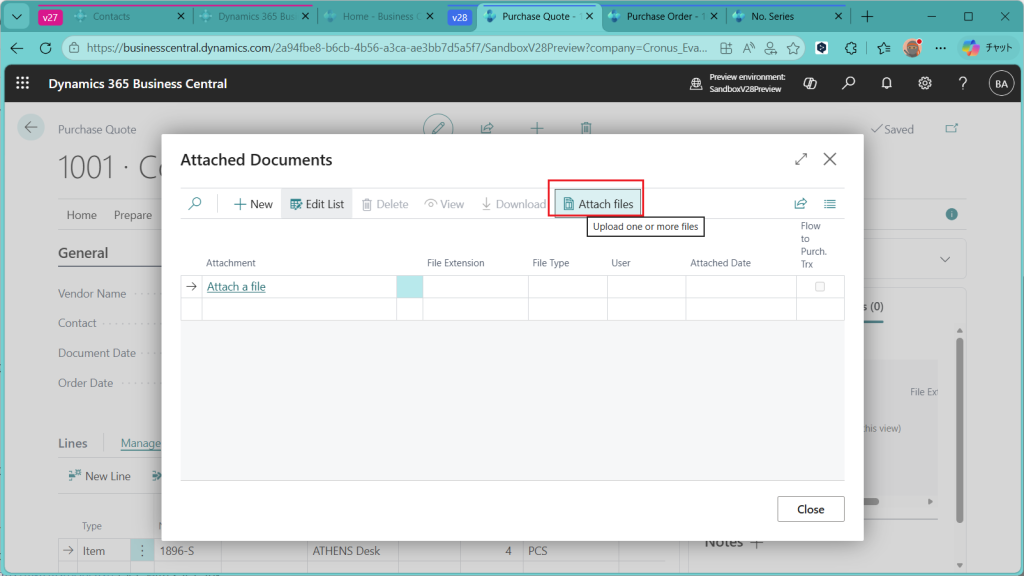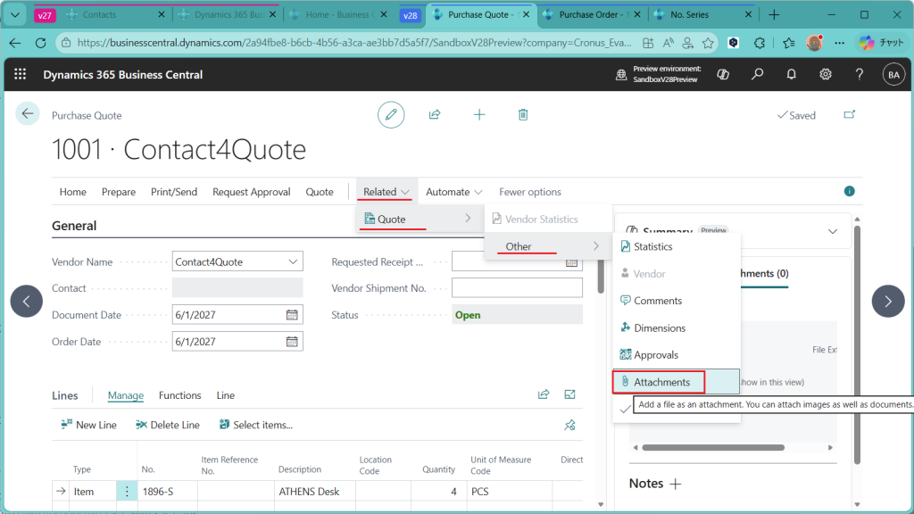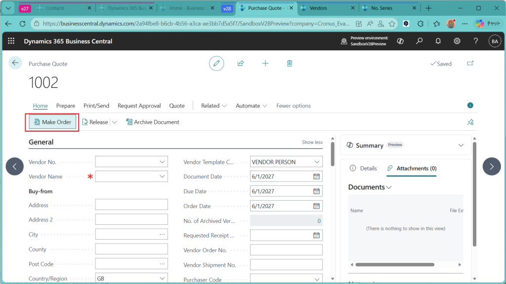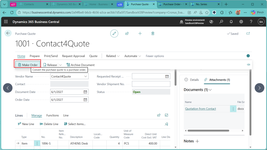 こちらはV27の画面です。比べてみるとわかりますが、”Create Purchase Quotes”というボタンはありません。