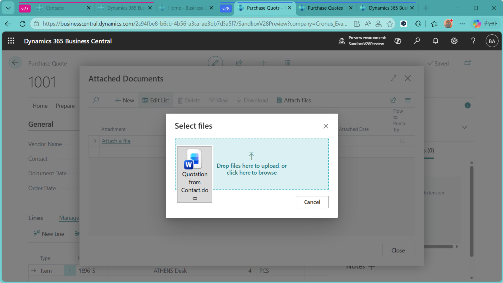 リンクをクリックするとファイルを見ることができます(が、今回は割愛。)このファイルは後ほど購買見積を発注に変換した際に引き継がれます。
