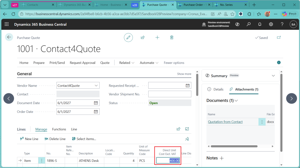 受け取った見積書に記載されている見積単価をPurchaseQuoteに反映します。この金額は後ほど購買見積を発注に変換した際に引き継がれます。