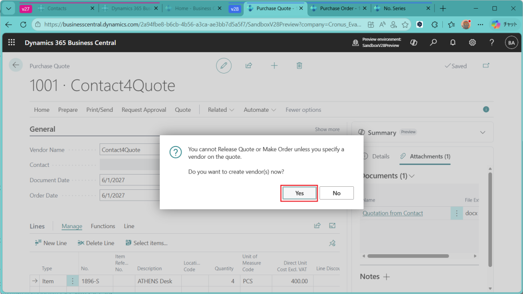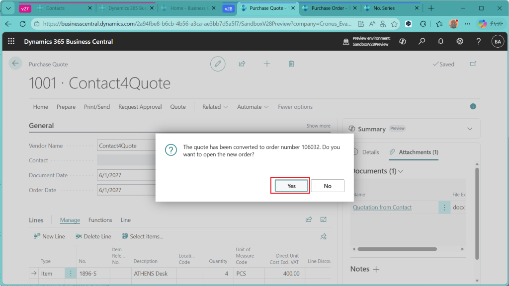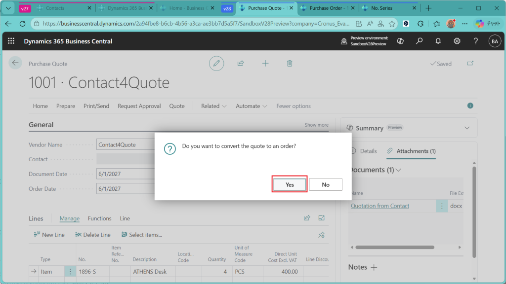 見積を発注に変換するか?と聞かれているので”Yes”を選択。
