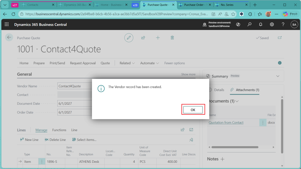 すると、購買見積が作成されました。仕入先(Vendor Name)には先ほど登録した連絡先(Contact)が設定されています。もう仕入先が登録されたのでしょうか?