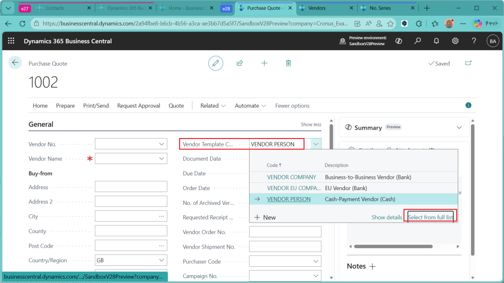 購買見積が作成されました。Generalタブに”Vendor Template Code”という項目があり、ここに”Vendor Person”という値がセットされています。プルダウンで選択肢を確認すると他に”Vendor Company”と”Vendor EU Company”があります。”Select from Full List”をクリックして、この選択肢の全体像を見てみます。