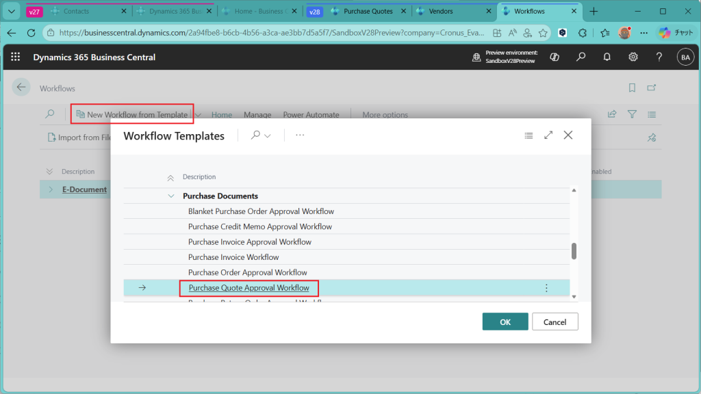 Cronusで購買見積のWorkflowを回そうとすると、Workflowが設定されていないというエラーになります。