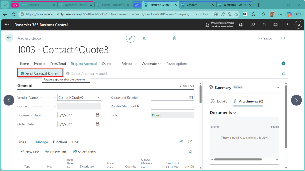 購買見積に戻ります。Workflowが有効化されたので、この状態では発注変換できません。”Send Approval Request”をクリック。
