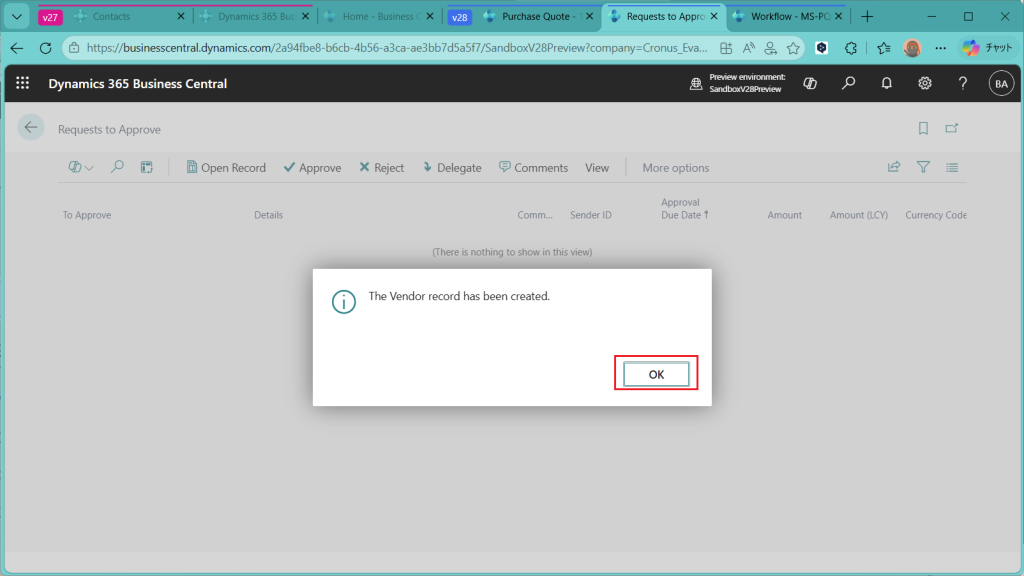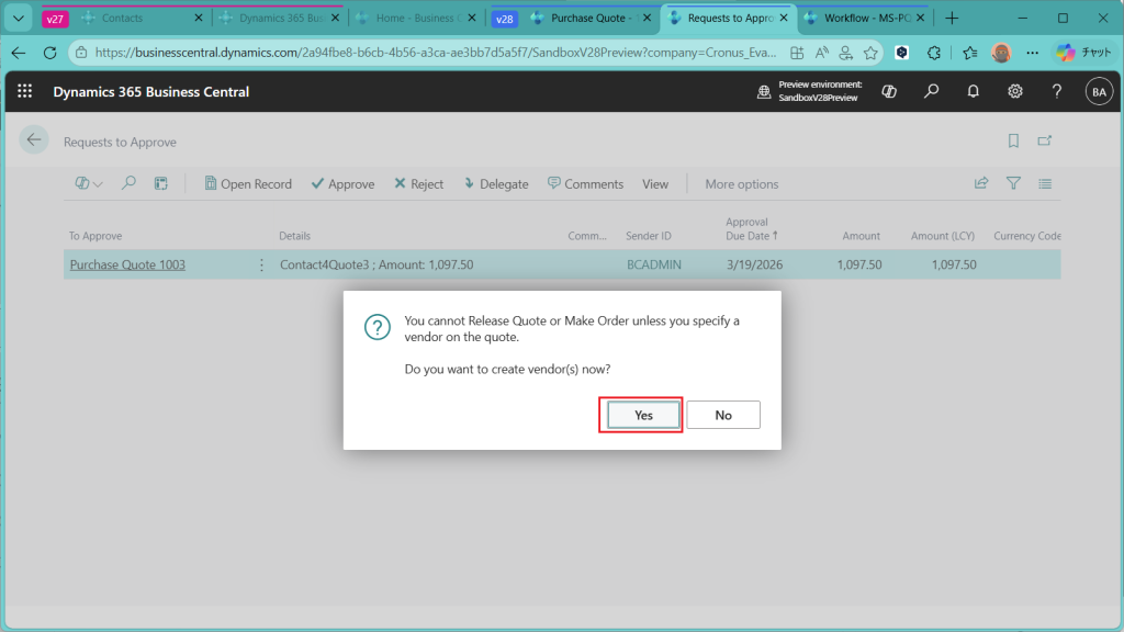 先ほどと同じメッセージが出てきました。承認するならリリースされて、リリースするなら仕入先登録が必要で、仕入先登録するか?を聞いています。”Yes”を選択。
