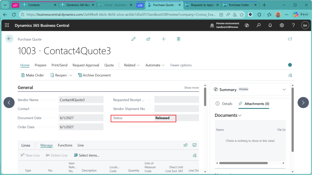 購買見積伝票に戻るとステータスが”Released”になっています。これで発注変換できるようになります。