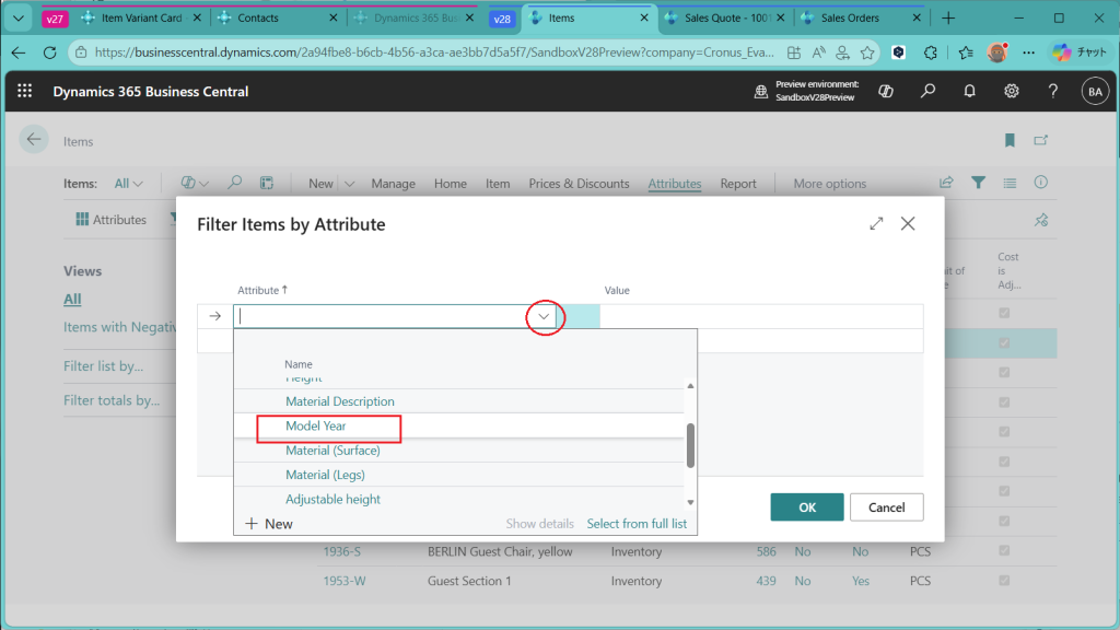 属性情報は検索性を高めるという役割があるので、モデル年度で検索してみます。品目一覧画面で”Filter by Attributes”クリック。