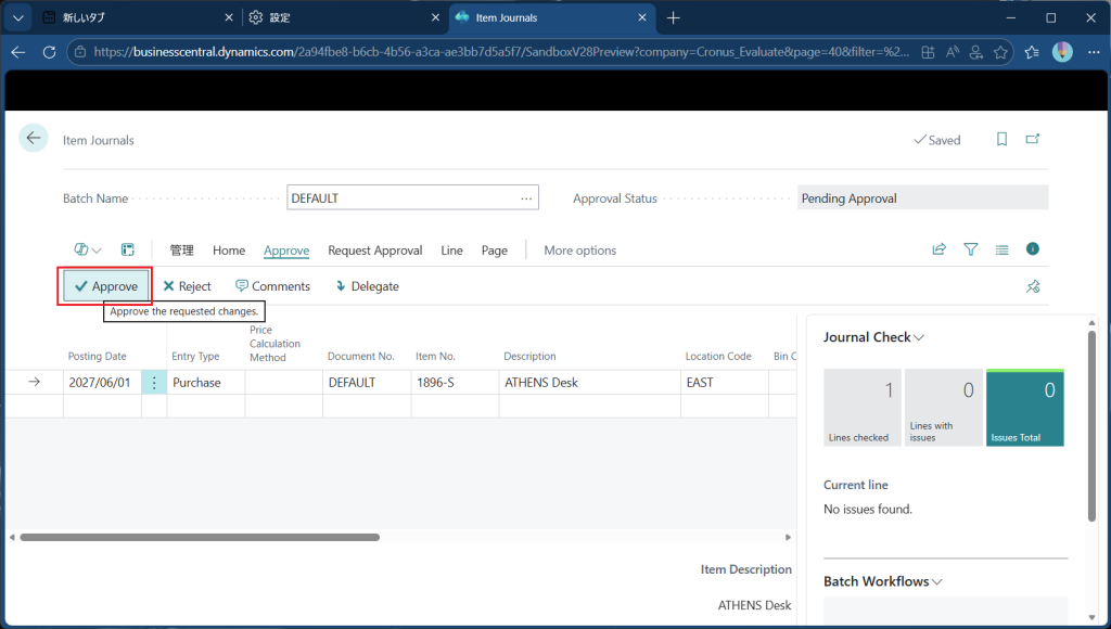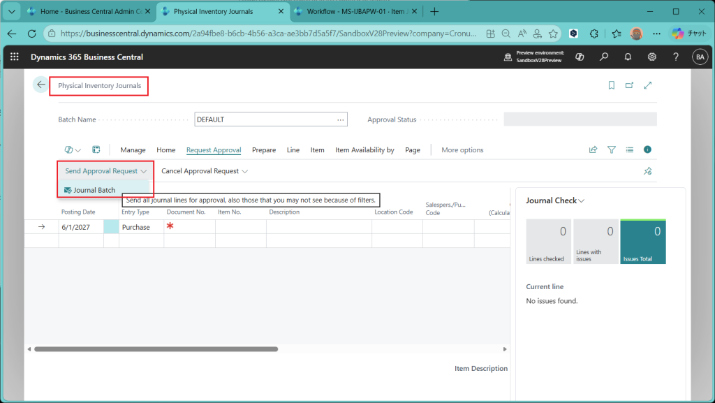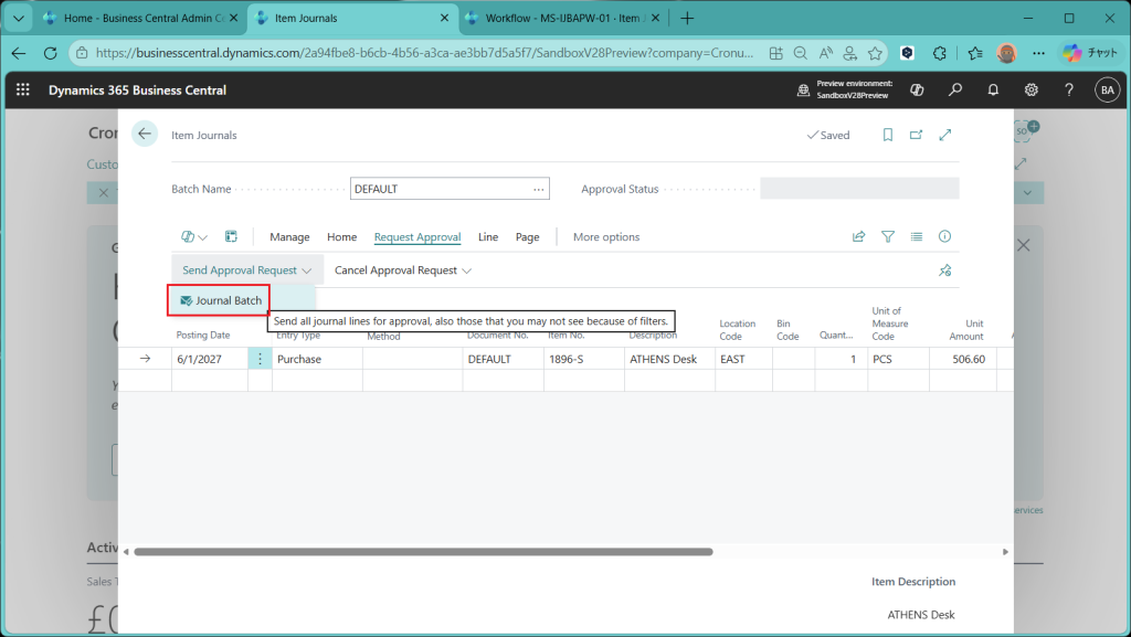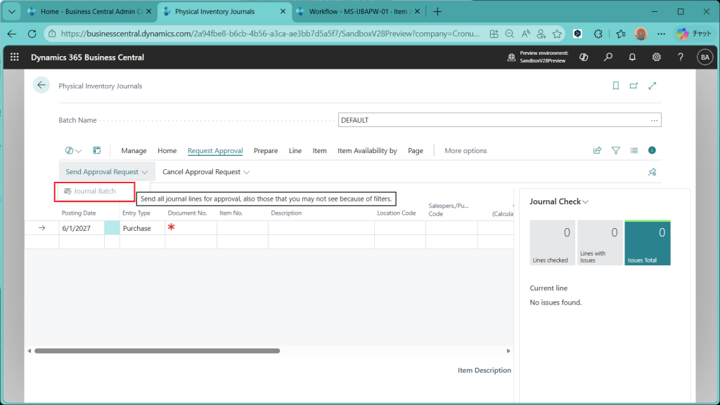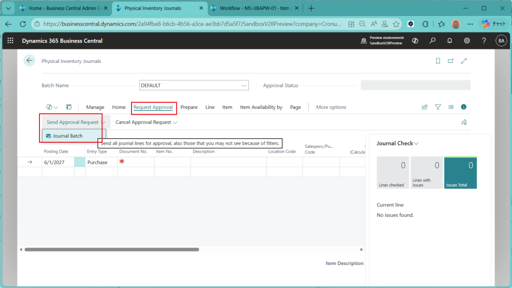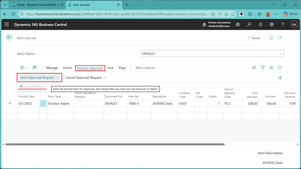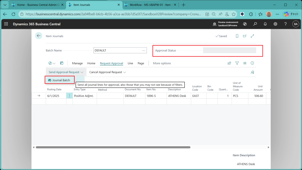 Item Journal(品目仕訳帳)画面が開きました。”Request Approval”というタブが追加されており、”Send Approval Request”というメニューの下に”Journal Batch”というボタンがあります。バッチ単位での承認ができる(=仕訳帳の複数の明細をまとめて承認できる)ということになります。