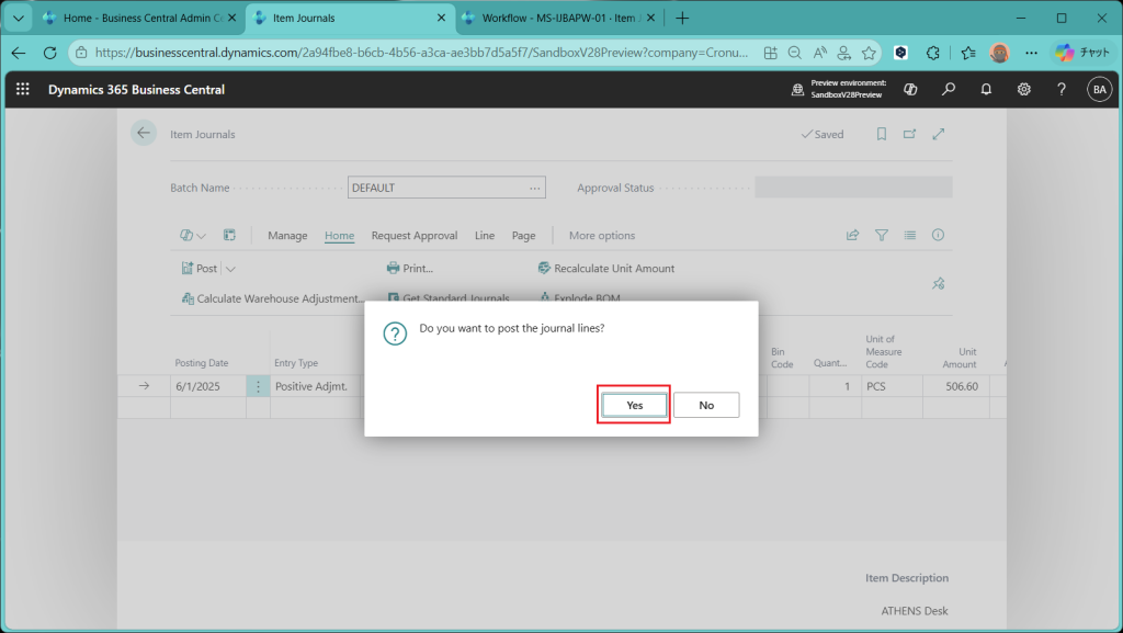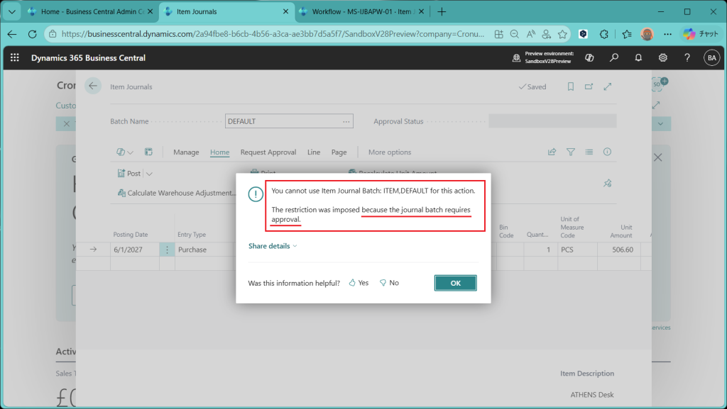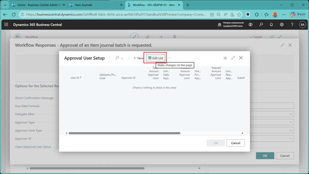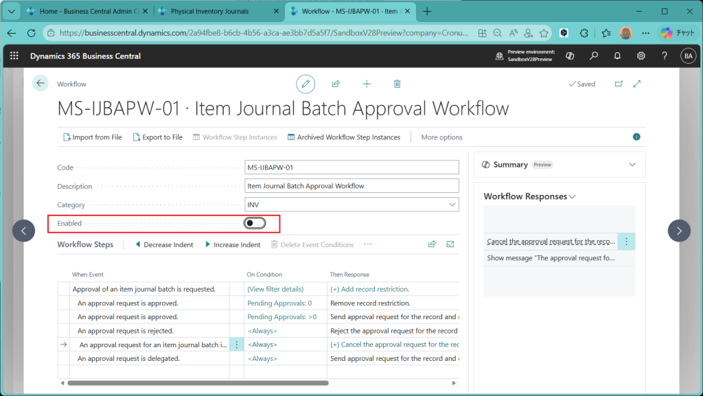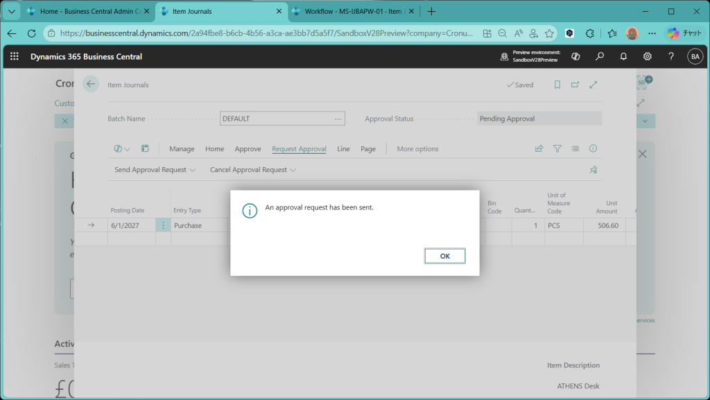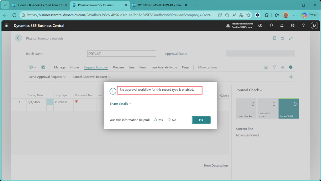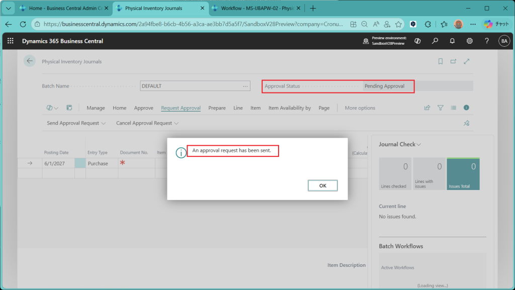 (ref.) https://learn.microsoft.com/ja-jp/dynamics365/business-central/dev-itpro/whatsnew/preview-feature-details#approval-workflows-for-item-journals