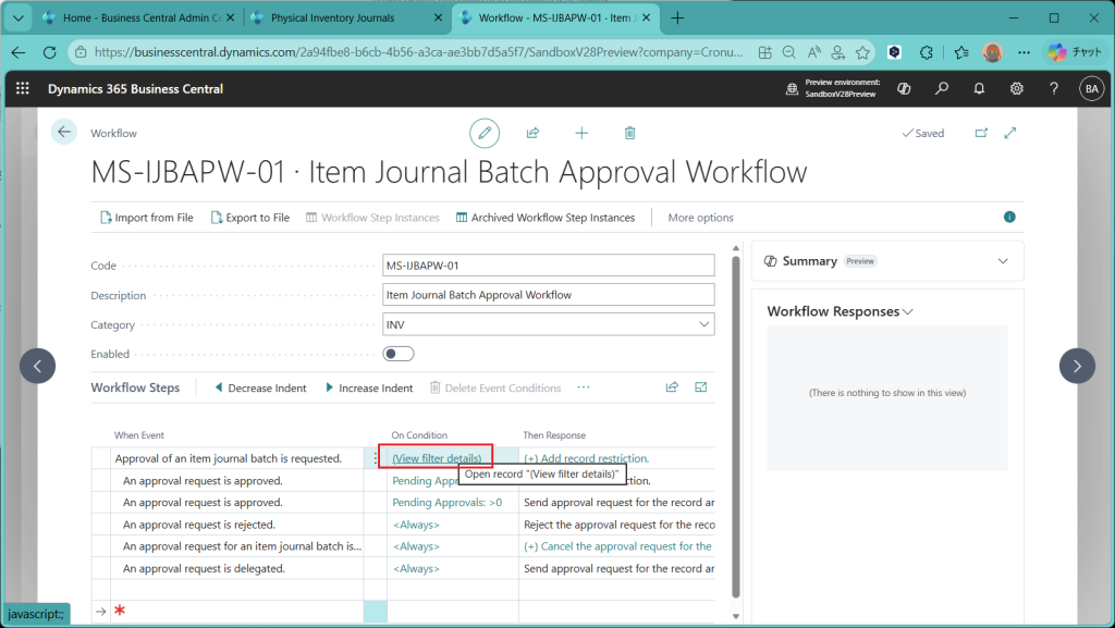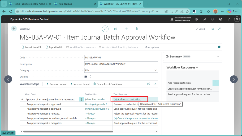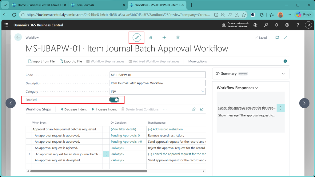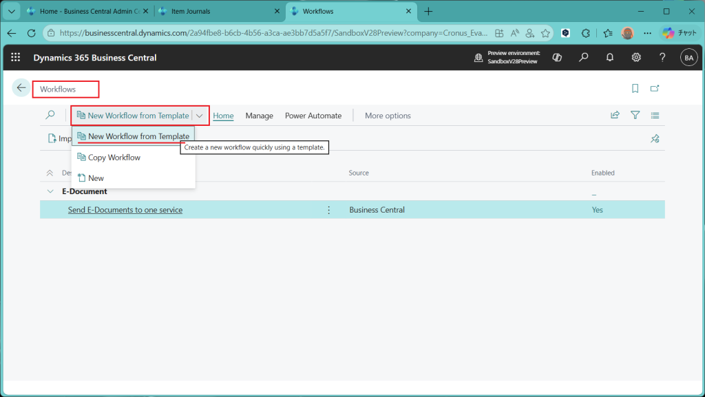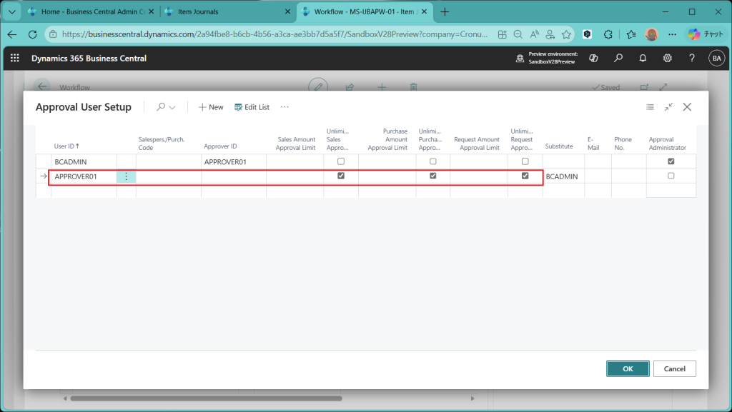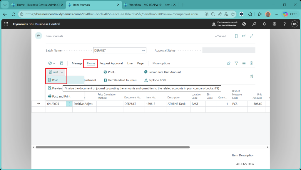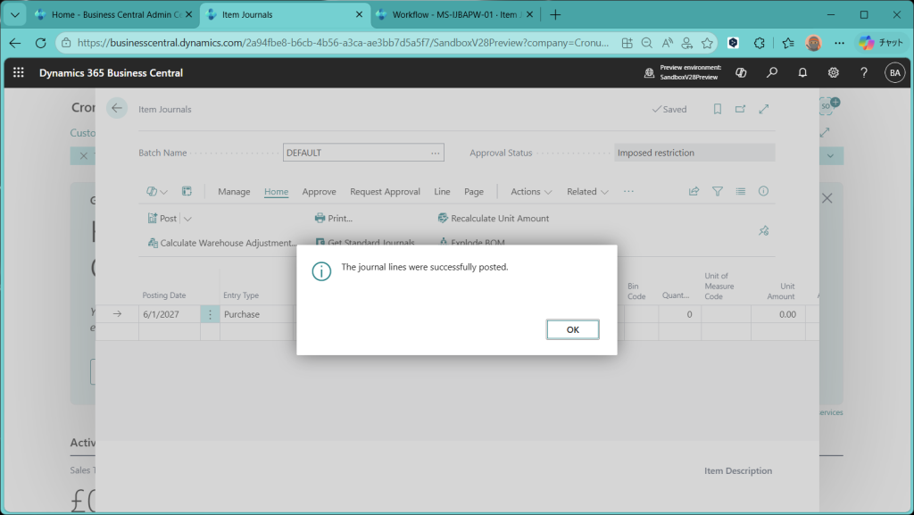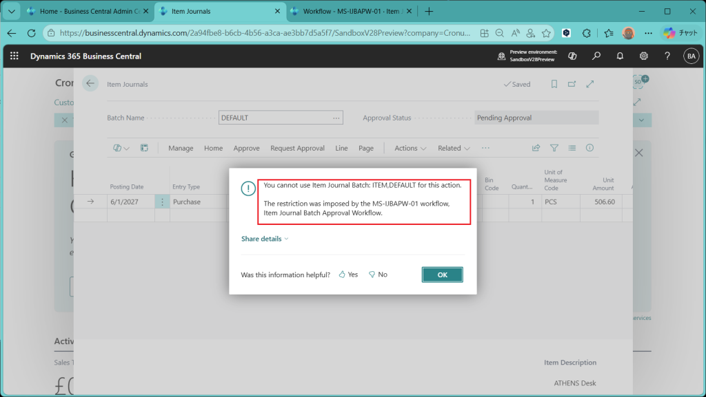 (ref.) https://learn.microsoft.com/ja-jp/dynamics365/business-central/dev-itpro/whatsnew/preview-feature-details#approval-workflows-for-item-journals