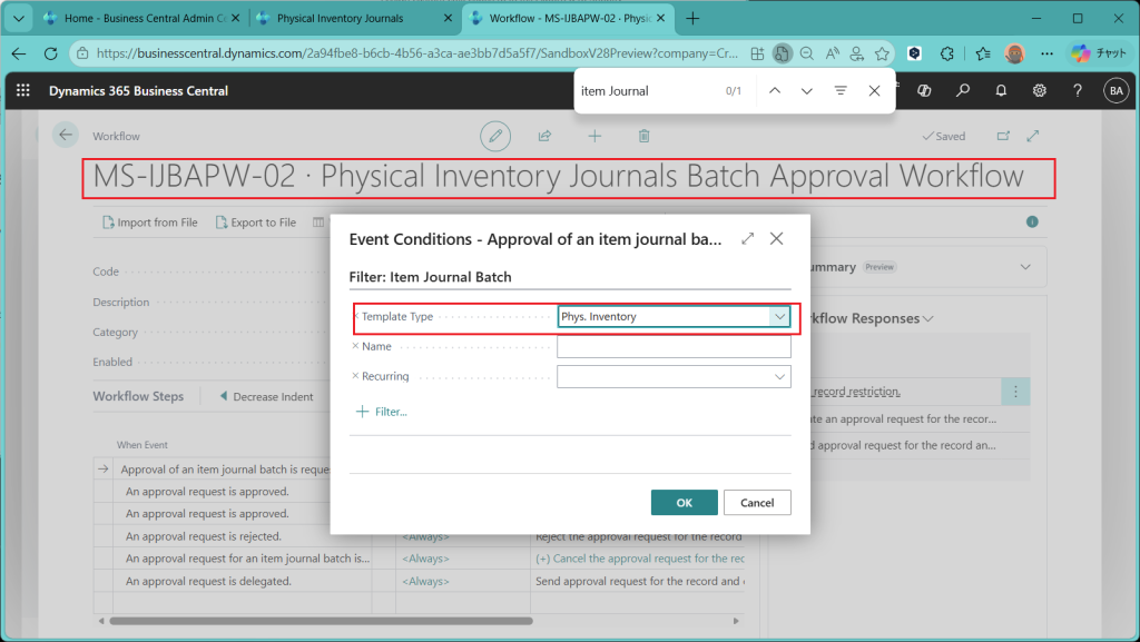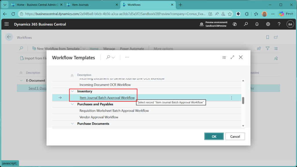 テンプレートの中のInventory(在庫)のカテゴリの下に”Item Journal Batch Approval Workflow”というワークフローテンプレートがあります。これは今回のバージョンから新設されたものです。これを選択してOKを押します。