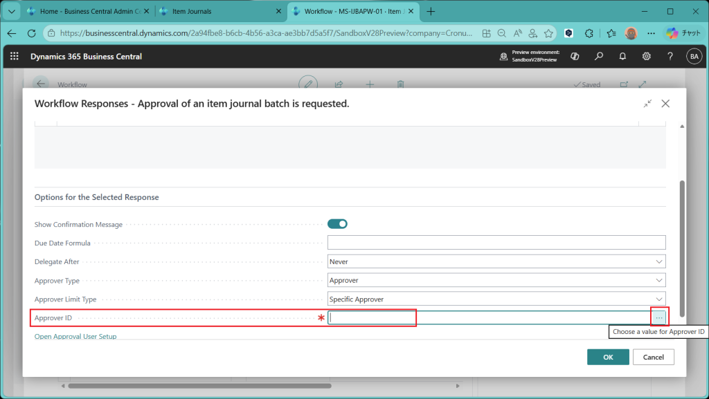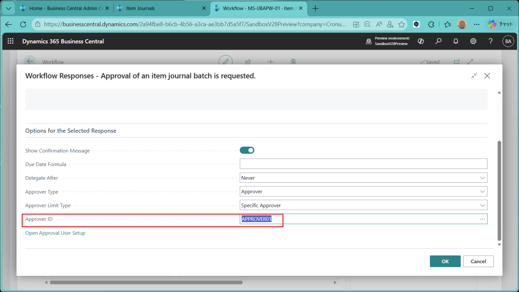 上の画面で承認ユーザーを承認者の候補リストに追加したらワークフローの定義画面で”Approver IDに”承認者のユーザーIDを指定できるようになります。OKを押して画面をクローズします。
