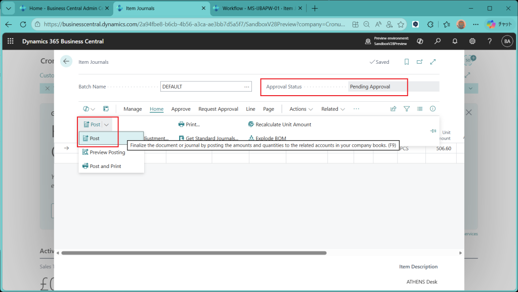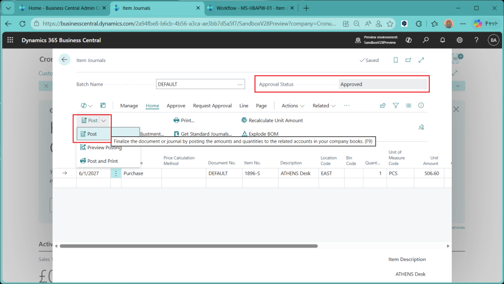さて、承認されたので今度は承認依頼者側のItem Journal画面に戻ります。Approval Statusが”Approved”になっており、承認されたことがわかります。転記してみましょう。