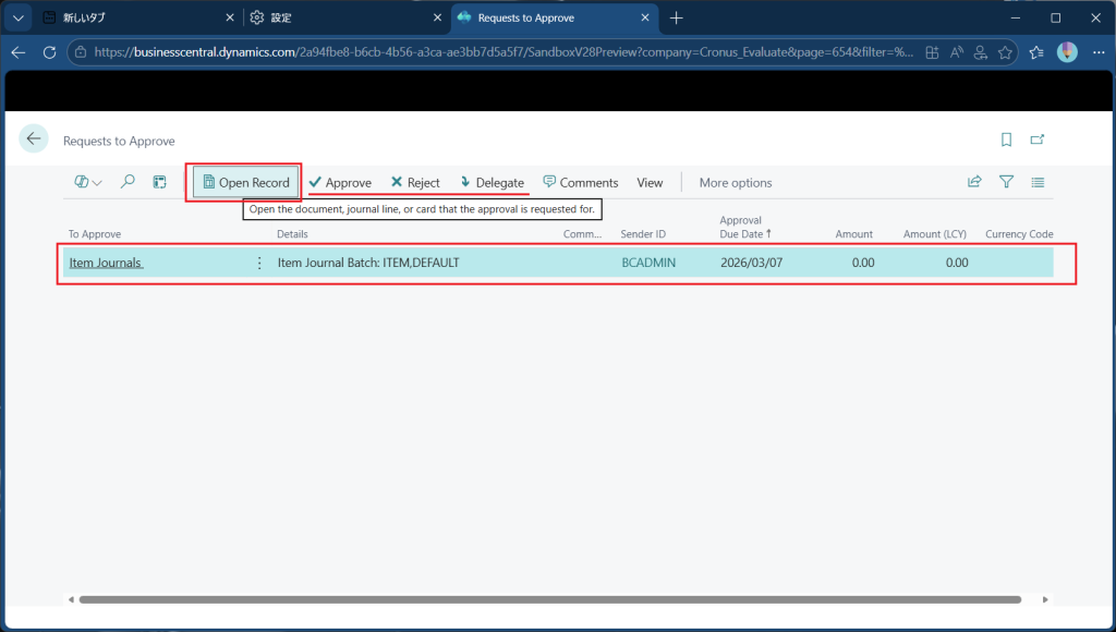 先ほどの承認依頼が表示されています。この画面でApproveボタン押して承認することもできますが、”Open Record”ボタンを押して内容を確認します。