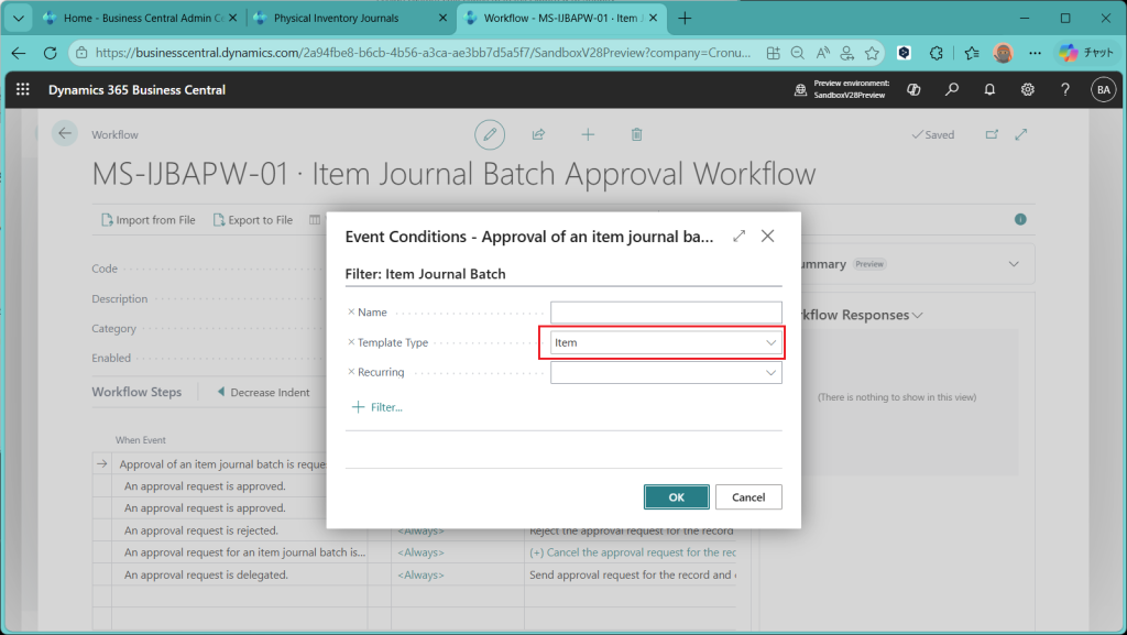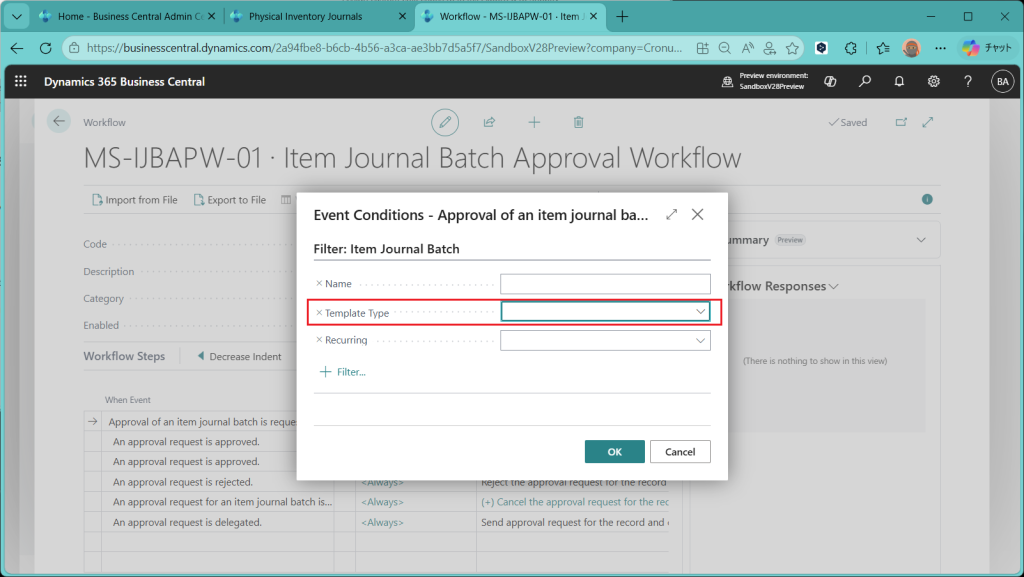 ここはワークフローの起動条件を設定する画面で、ここで”Template Type”がブランクだとItem JournalもPhysical Inventory Journalもこのワークフローで処理することになります。