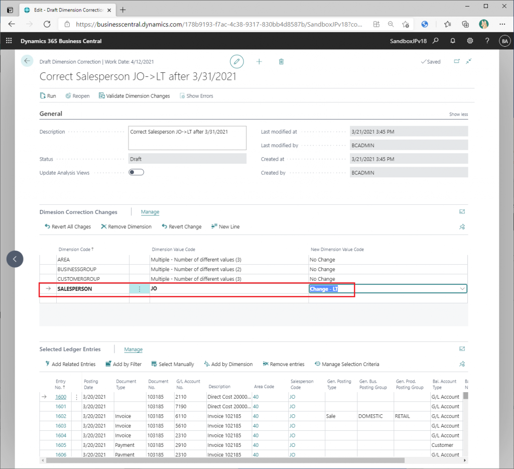 修正対象データを抽出できたので、いよいよ分析コードの値を修正します。中段の”Dimension Correction Changes”セクションには分析項目名と現在の値、変更後の値が表示されています。”Salesperson”列の変更後の値をプルダウンから”LT”に指定すると以下のように表示されます。