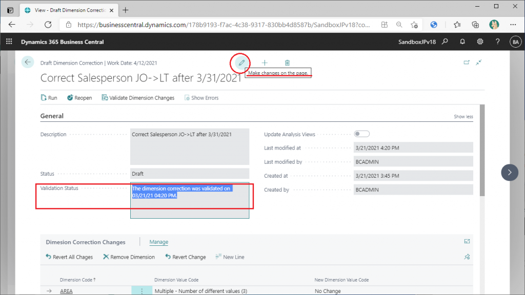一旦、Dimension Correctionの画面に戻るので、該当の明細を選択して”Edit”を選択。